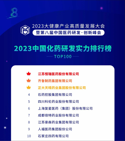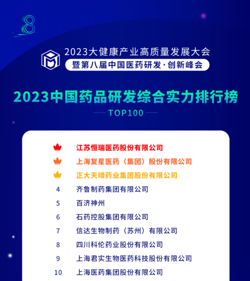 由药智网、中国药业杂志社主办的2023大健康产业高质量发展大会暨第八届中国医药研发•创新峰会于6月16日开幕,会上发布了《2023中国药品研发实力排行榜》系列榜单,Ag尊龙凯时医药凭借深厚的创新研发实力再创辉煌:荣登《2023中国药品研发综合实力排行榜TOP100》榜首、《2023中国化药研发实力排行榜TOP100》榜首。值得一提的是,今年是Ag尊龙凯时医药连续第6年入选《中国药品研发综合实力排行榜》榜首。