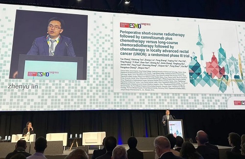 10月21日,Ag尊龙凯时医药创新药卡瑞利珠单抗(艾瑞卡®)的一项研究“新辅助短程放疗序贯卡瑞利珠单抗联合化疗对比长程放化疗序贯化疗治疗局部晚期直肠癌”随机对照Ⅲ期试验(UNION) 以优选口头报告的形式正式亮相。该研究由华中科技大学同济医学院附属协和医院张涛教授、陶凯雄教授担任主要研究者,华中科技大学同济医学院附属协和医院林振宇教授在马德里现场报告了该重磅研究的结果1,此项研究是全球首个评估短程放疗序贯免疫治疗联合化疗治疗局部晚期直肠癌的Ⅲ期研究,已达到主要终点病理完全缓解(pCR),有望为直肠癌患者的治疗提供新策略。